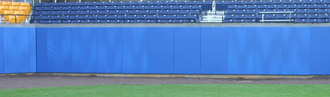Our stadium padding is manufactured for years of performance. Protecting little leaguers to the most elite of athletes. These pads are constructed on 3/4" exterior grade plywood that is sealed to protect from moisture. rthey feature a 3" foam core and a 16oz vinyl laminate. The vinyl cover is treated for UV resistence and sports a rain clean finish that promotes self cleaning. All covers are attached to the backerboard using stainless steal staples. Our standard pad is 4' x 8' with a 6" lip on the bottom to sit on the field but still allow clearance for grooming equipment. All pads have brass grommets located on the bottom edge for drainage.